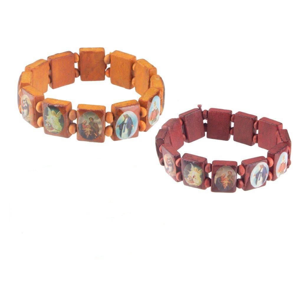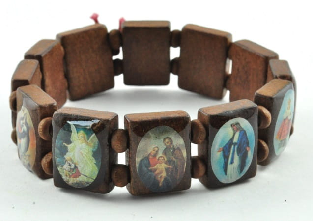 Bransoletka drewniana z na gumce z wizerunkami świętych.