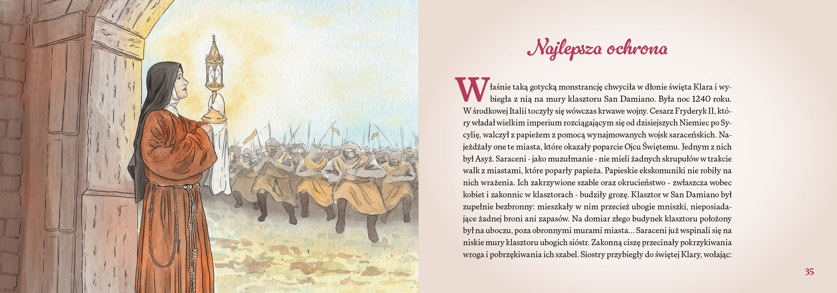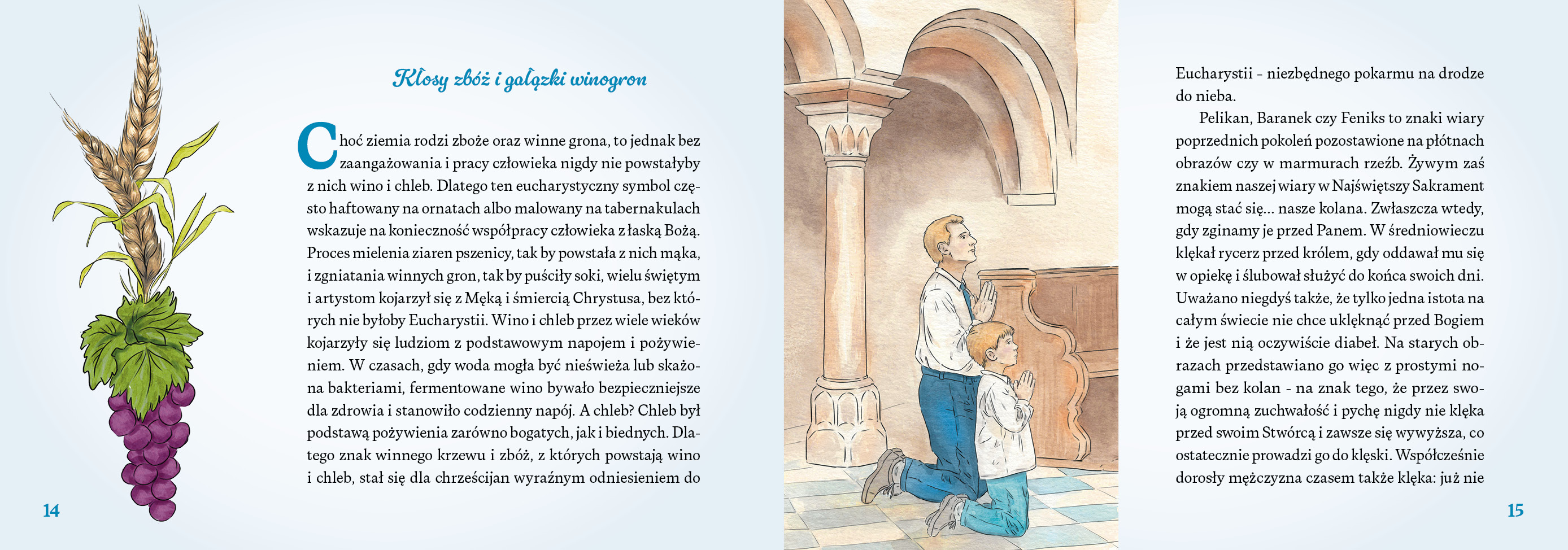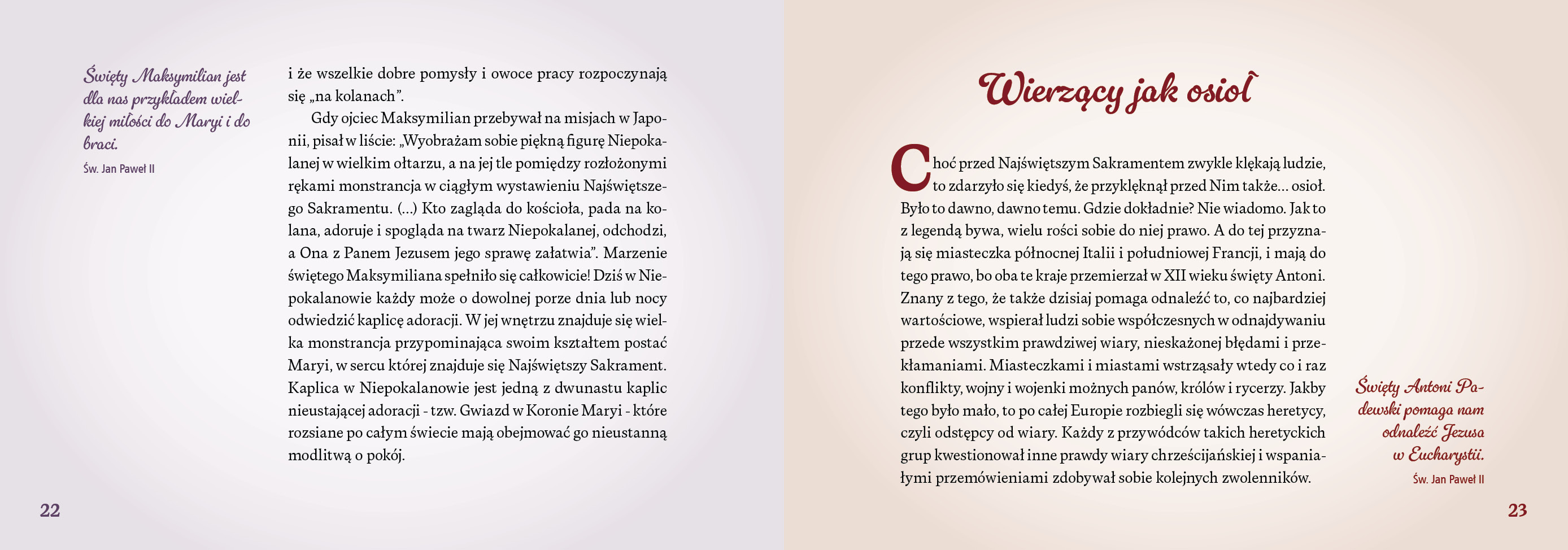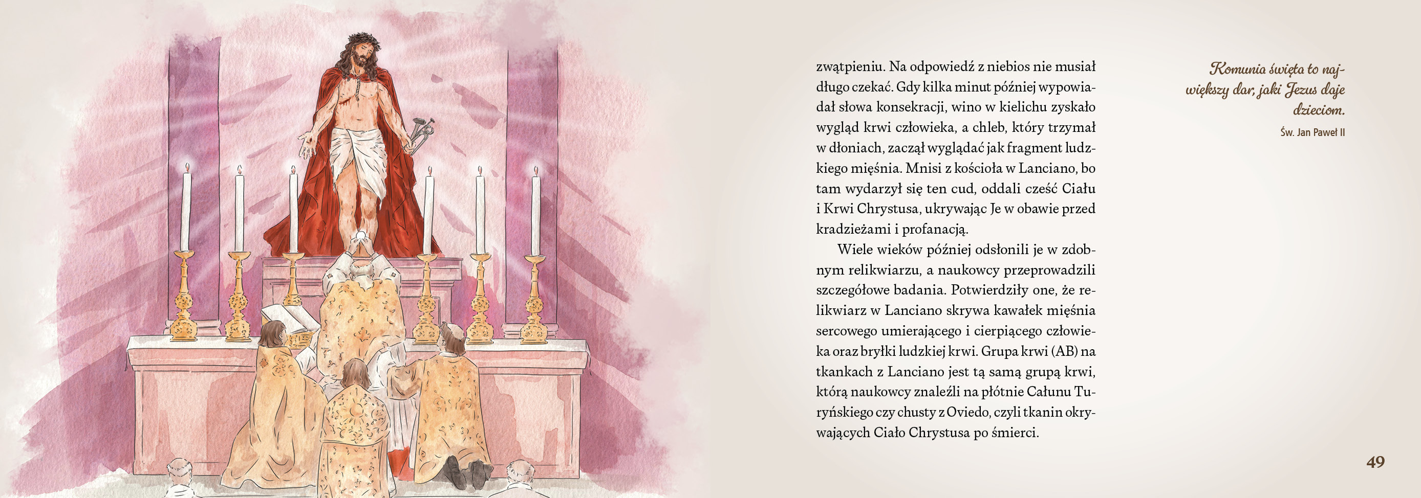 Dzieci poznają tu słowa samego Pana Jezusa, uczą się, czym jest Msza święta, i spotykają świętych, którzy szczególnie umiłowali Eucharystię – jak św. Tarsycjusz czy św. Jan Paweł II. Wzruszające cytaty Papieża Polaka, skierowane do najmłodszych, pomagają jeszcze lepiej zrozumieć, jak wielkim darem jest Komunia święta.