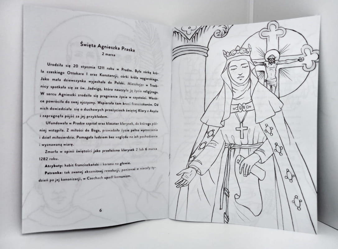 Kolorowanka z krótkimi opisami świętych przybliża dzieciom świętych patronów.