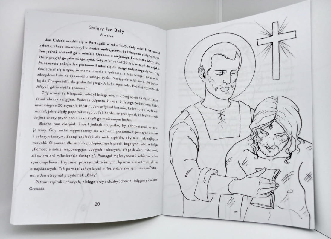 Kolorowanka z krótkimi opisami świętych przybliża dzieciom świętych patronów.