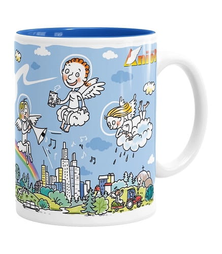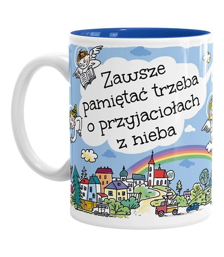 Biały kubek ceramiczny z niebieskim wnętrzem, oraz nadrukowaną grafiką zaczerpniętą z miesięcznika Anioł Stróż.