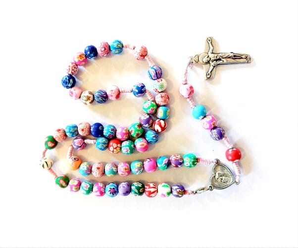 Różaniec z koralików z kwiecistymi dekoracjami, łącznikiem z metalu z ziemią z Medjugorje i krzyżem.
