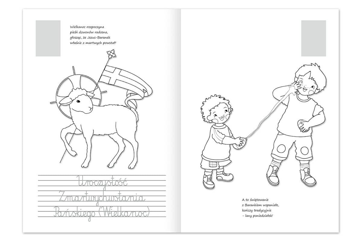 W książeczce znalazły się takie święta, jak: Chrzest Święty, Adwent, Wigilia, Boże Narodzenie, Uroczystość Objawienia Pańskiego, Dzień Babci i Dziadka, Święto Matki Bożej Gromnicznej, Tłusty czwartek, Środa Popielcowa, Wielki Post, Niedziela Palmowa, Wielki Tydzień, Wielkanoc, Święto Bożego Miłosierdzia; Zielone Świątki, Dzień Matki, Nabożeństwa majowe, Boże Ciało, Dzień Dziecka, Nabożeństwa czerwcowe, Dzień Ojca, Wspomnienie św. Krzysztofa, Matki Bożej Zielnej, Święto św. Stanisława Kostki, Nabożeństwa różańcowe, a także niedzielna Msza Święta.